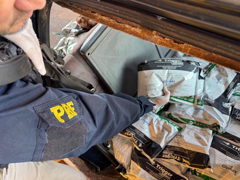 Chama a atenção o fato de o veículo estar equipado com uma antena de internet via satélite em pleno funcionamento, instalada sobre o painel, prática comumente utilizada para facilitar a comunicação durante o transporte do ilícito.