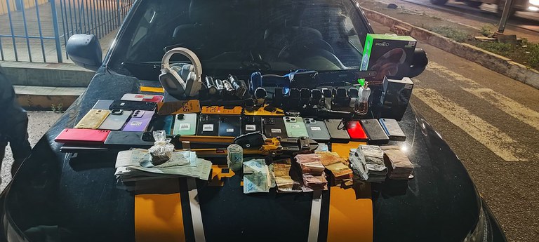 No interior do veículo, os policiais encontraram um verdadeiro estoque de produtos subtraídos e equipamentos utilizados para romper obstáculos. O balanço final da ocorrência contabilizou: